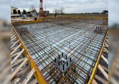 Le fondazioni sono stata realizzate in calcestruzzo armato, utilizzando sia soluzioni a platea, ideali per una distribuzione uniforme dei carichi, sia sistemi a travi rovesce di sezione rettangolare, pensati per resistere efficacemente alle sollecitazioni su terreni di diversa consistenza
