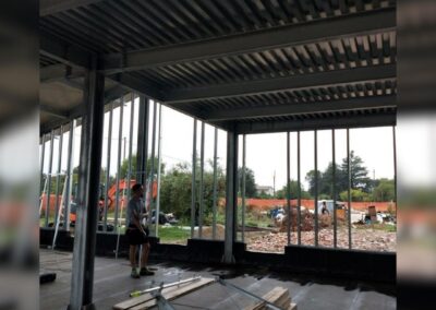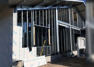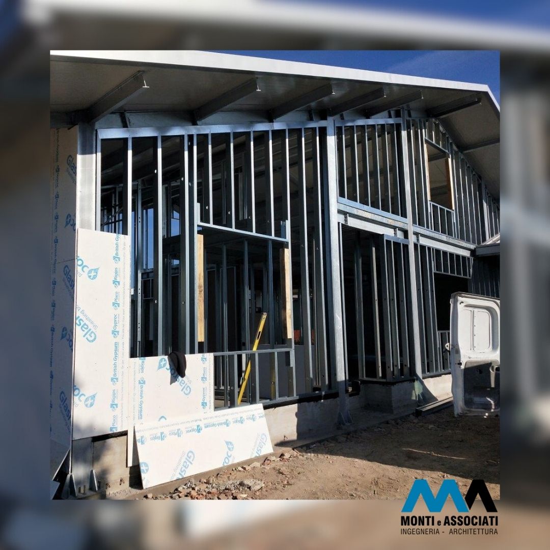 • Pareti perimetrali realizzate con a secco, formate da pannelli modulari montati su una sottostruttura metallica. Questo sistema consente una rapida installazione e garantisce elevate prestazioni termiche e acustiche, grazie all’integrazione di materiali isolanti all’interno delle intercapedini.