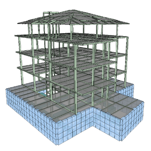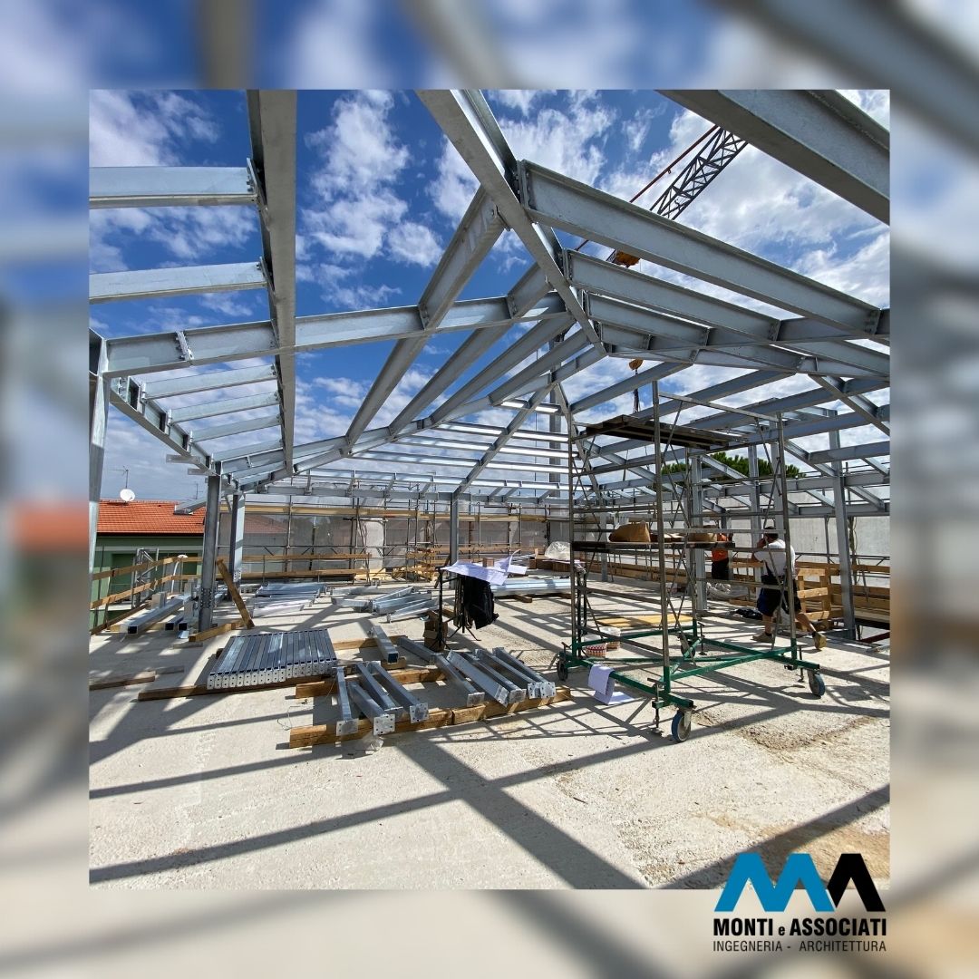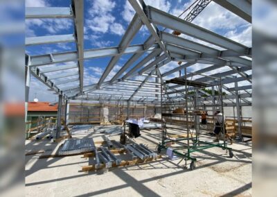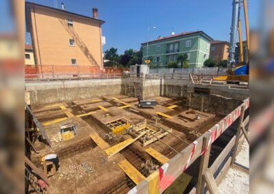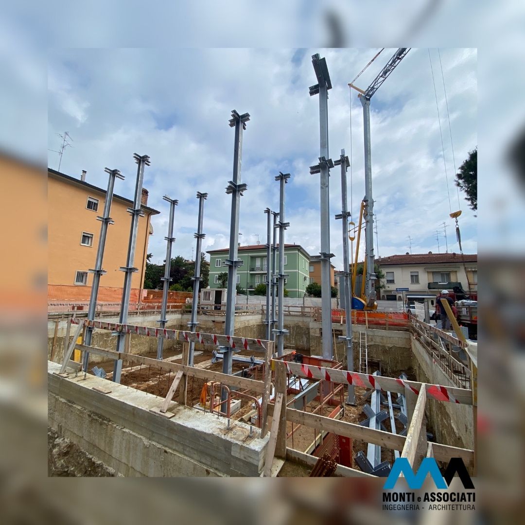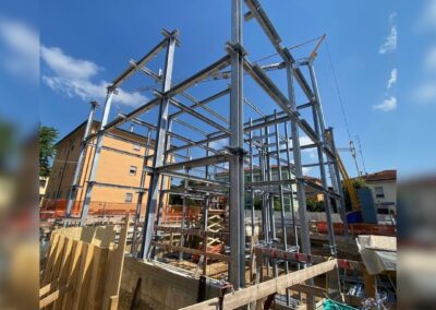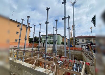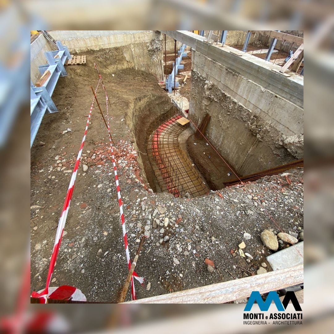 Data la presenza di edifici adiacenti, si è reso necessario progettare il piano interrato con pareti perimetrali in diaframmi di cemento armato, che offrono sia contenimento contro la spinta del terreno che una solida base di supporto per la struttura in acciaio in elevazione.