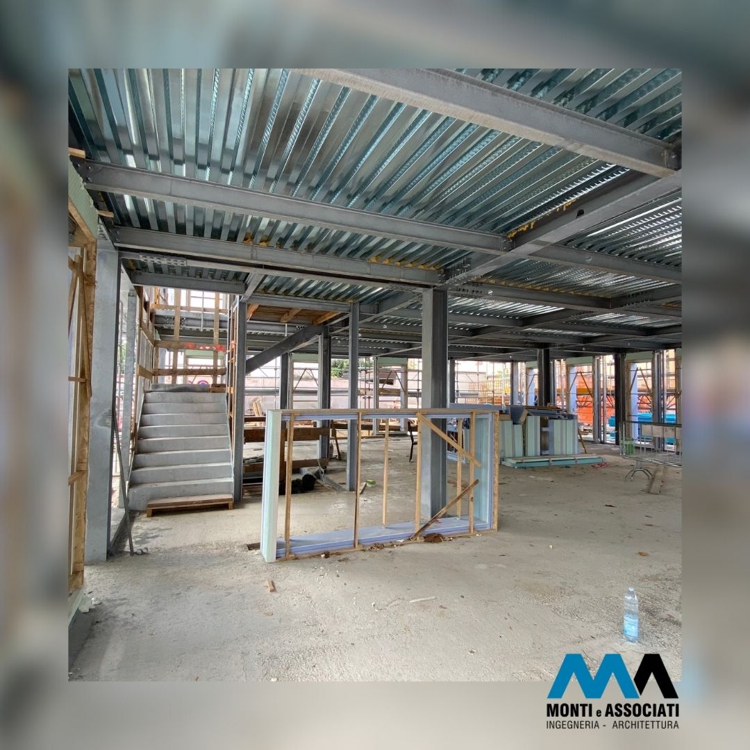 Tutti i solai sono costruiti utilizzando lamiere collaboranti tipo HI-BOND, una soluzione che permette un’interazione efficace tra acciaio e cemento, rendendo i solai rigidi e in grado di distribuire i carichi in modo efficiente su tutta la struttura. Questi solai sono progettati con cavedi integrati, che consentono l’alloggiamento degli impianti tecnici, inclusi quelli per la scala principale e l’ascensore.