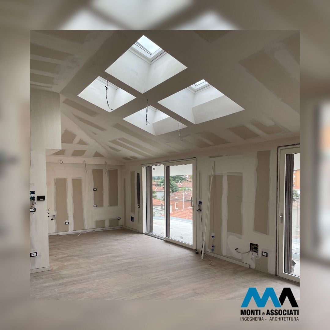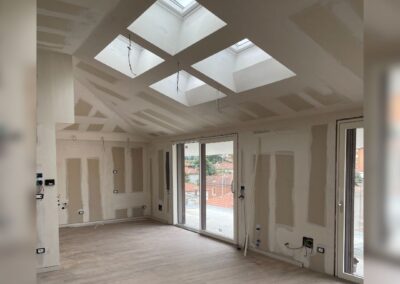 Per i tamponamenti esterni, si è optato per una costruzione a secco con materiali leggeri, come pannelli in cartongesso, lana minerale e poliuretano, che contribuiscono a ridurre il peso complessivo della struttura e a migliorare le prestazioni di isolamento termico e acustico.